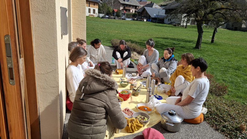 Alimentation végétarienne adaptée à la pratique, tout le monde participe à la cuisine.